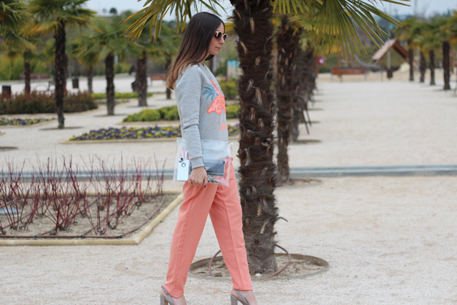 Hola hola a mi súper guapa! ADORO con mayúsculas y en negrita tu outfit, perfecto, estás guapísima con esa sudadera de flamencos que me he enamorado, con las súper gafas, que las quiero y ese mega clutch transparente que ahora mismo me has creado una necesidad gigante!
